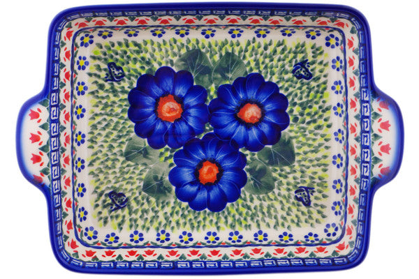 This Polish Pottery Rectangular Baker with Handles is handmade and handpainted by the Ceramika Bona factory in Boleslawiec, Poland. Manufacturer item number H3585Q. It is 2¼" high and measures 11½" by 8¼". The capacity of this Rectangular Baker with Handles is 348.62 oz (brimful) and it weighs 22.4 lbs. It is part of the Brilliant Butterfly Popp Collection.