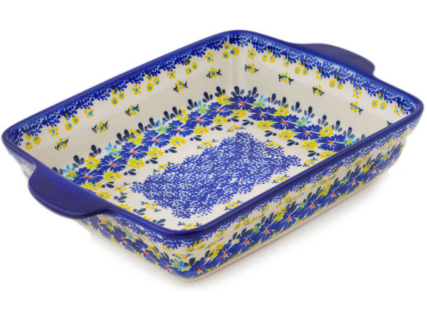 This Polish Pottery Rectangular Baker with Handles is handmade and handpainted by the Ceramika Bona factory in Boleslawiec, Poland. Manufacturer item number H8705Q. It is 2¼" high and measures 11½" by 8¼". The capacity of this Rectangular Baker with Handles is 348.62 oz (brimful) and it weighs 22.4 lbs. It is part of the Cornflower Meadow Collection.