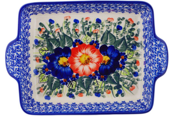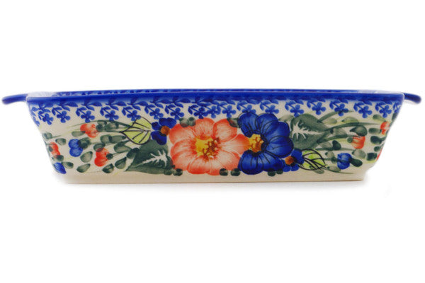 This Polish Pottery Rectangular Baker with Handles is handmade and handpainted by the Ceramika Bona factory in Boleslawiec, Poland. Manufacturer item number H7174Q. It is 2¼" high and measures 11½" by 8¼". The capacity of this Rectangular Baker with Handles is 348.62 oz (brimful) and it weighs 22.4 lbs. It is part of the Poppy Trio Collection.