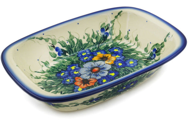 This Polish Pottery Rectangular Baker with Handles is handmade and handpainted by the Cer-Raf factory in Boleslawiec, Poland. Manufacturer item number H3833K. It is 2¼" high and measures 11¼" by 7¾". The capacity of this Rectangular Baker with Handles is 38.72 oz (brimful) and it weighs 2.2 lbs. It is part of the Spring Bouquet Collection.