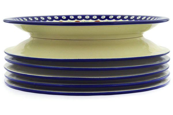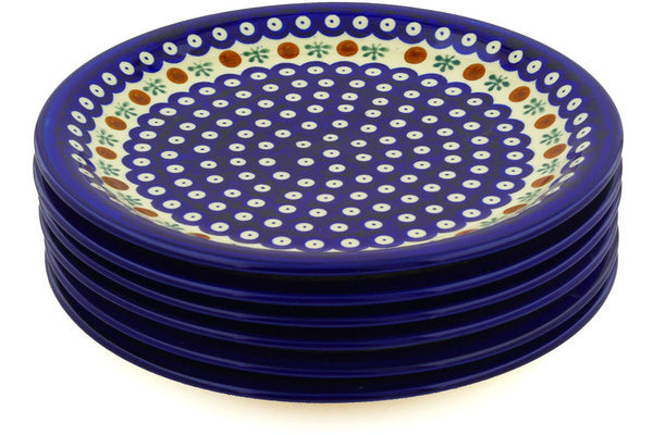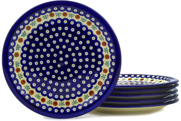 This Polish Pottery Set of 6 Plates is handmade and handpainted by the Zaklady Ceramiczne factory in Boleslawiec, Poland. Manufacturer item number H6610E. It is 1" high and measures 10¾" by 10¾". The weight of this Set of 6 Plates is 13.9 lbs. It is part of the Mosquito Collection.