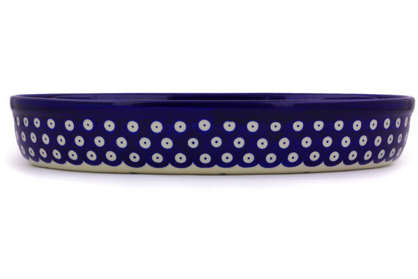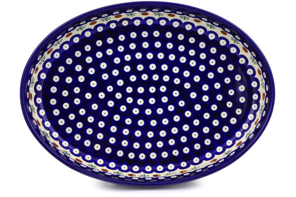 This Polish Pottery Oval Baker is handmade and handpainted by the Zaklady Ceramiczne factory in Boleslawiec, Poland. Manufacturer item number H7935A. It is 2¼" high and measures 12½" by 9¼". The capacity of this Oval Baker is 72.23 oz (brimful) and it weighs 2.5 lbs. It is part of the Mosquito Collection.
