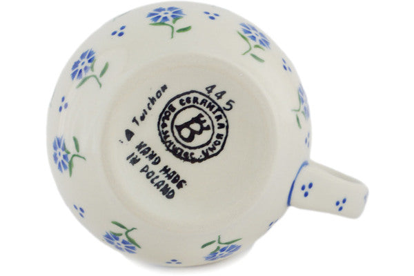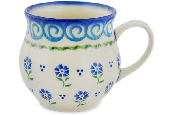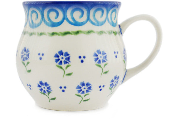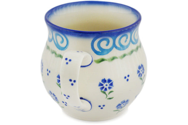 This Polish Pottery Bubble Mug is handmade and handpainted by the Ceramika Bona factory in Boleslawiec, Poland. Manufacturer item number H0311N. It is 3½" high and measures 4¾" by 3¾". The capacity of this Bubble Mug is 11.77 oz (brimful) and it weighs 0.6 lbs. It is part of the Blue Bursts Collection.