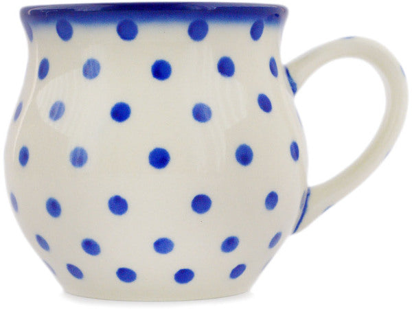 This Polish Pottery Bubble Mug is handmade and handpainted by the Ceramika Bona factory in Boleslawiec, Poland. Manufacturer item number H9760Q. It is 3½" high and measures 4¾" by 3¾". The capacity of this Bubble Mug is 11.77 oz (brimful) and it weighs 0.6 lbs. It is part of the Blue Polka Dot Collection.