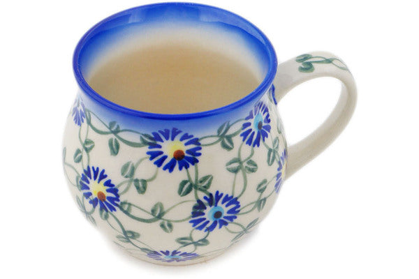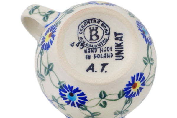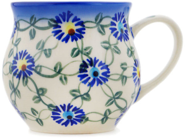 This Polish Pottery Bubble Mug is handmade and handpainted by the Ceramika Bona factory in Boleslawiec, Poland. Manufacturer item number H1932R. It is 3½" high and measures 4¾" by 3¾". The capacity of this Bubble Mug is 11.77 oz (brimful) and it weighs 0.6 lbs. It is part of the Blue Thistle Beauty Collection.