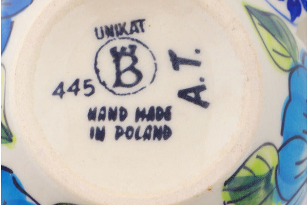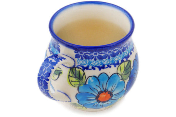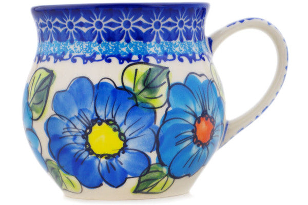 This Polish Pottery Bubble Mug is handmade and handpainted by the Ceramika Bona factory in Boleslawiec, Poland. Manufacturer item number H8727Q. It is 3½" high and measures 4¾" by 3¾". The capacity of this Bubble Mug is 11.77 oz (brimful) and it weighs 0.6 lbs. It is part of the Bold Blue Poppies Collection.