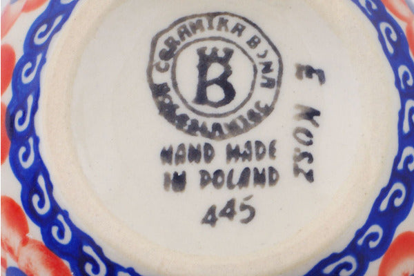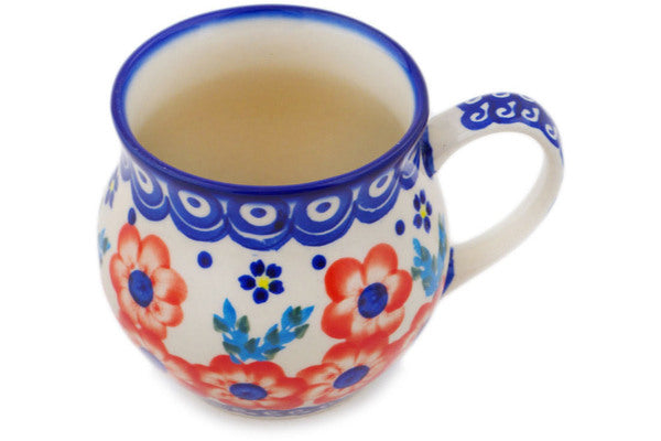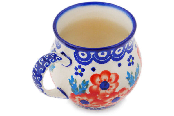 This Polish Pottery Bubble Mug is handmade and handpainted by the Ceramika Bona factory in Boleslawiec, Poland. Manufacturer item number H7097Q. It is 3½" high and measures 4¾" by 3¾". The capacity of this Bubble Mug is 11.77 oz (brimful) and it weighs 0.6 lbs. It is part of the Flower Star Collection.