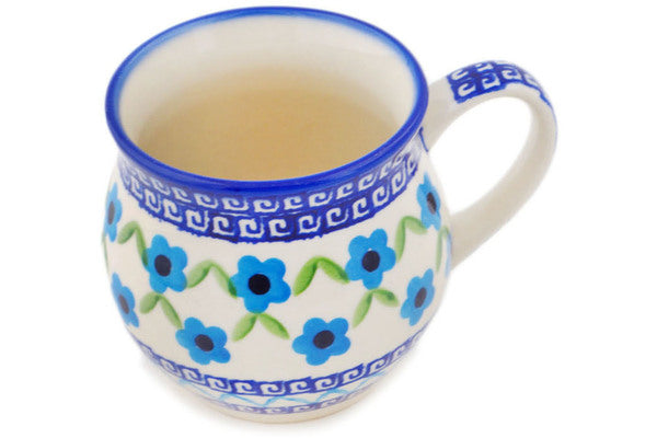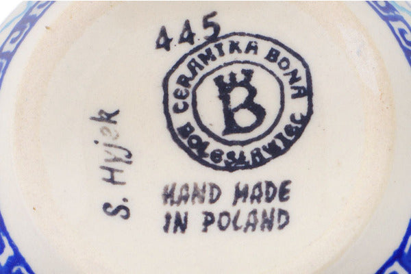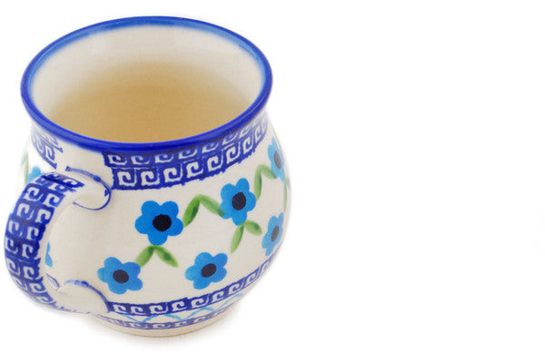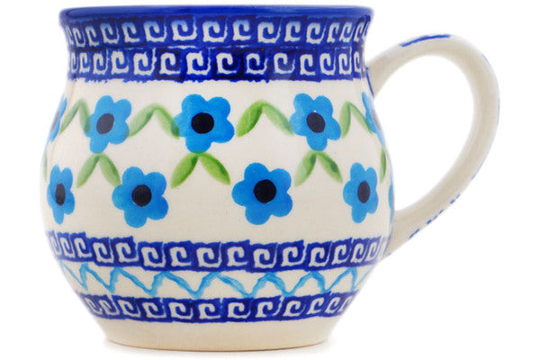 This Polish Pottery Bubble Mug is handmade and handpainted by the Ceramika Bona factory in Boleslawiec, Poland. Manufacturer item number H5758P. It is 3½" high and measures 4¾" by 3¾". The capacity of this Bubble Mug is 11.77 oz (brimful) and it weighs 0.6 lbs. It is part of the Greek Daisies Collection.