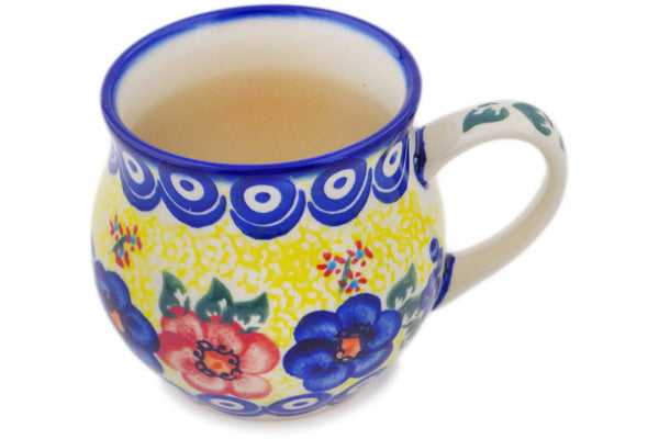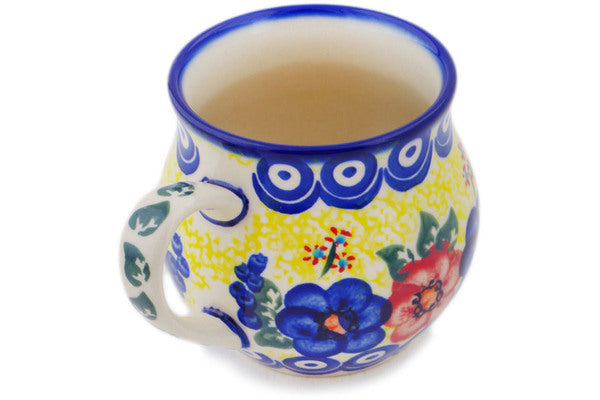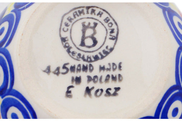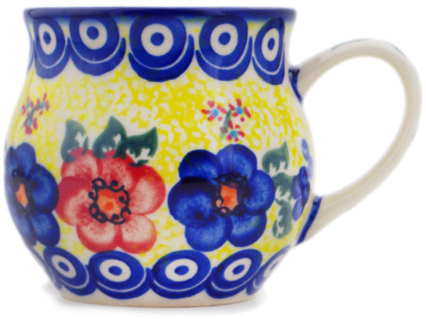 This Polish Pottery Bubble Mug is handmade and handpainted by the Ceramika Bona factory in Boleslawiec, Poland. Manufacturer item number H7098Q. It is 3½" high and measures 4¾" by 3¾". The capacity of this Bubble Mug is 11.77 oz (brimful) and it weighs 0.6 lbs. It is part of the Neon Poppies Collection.
