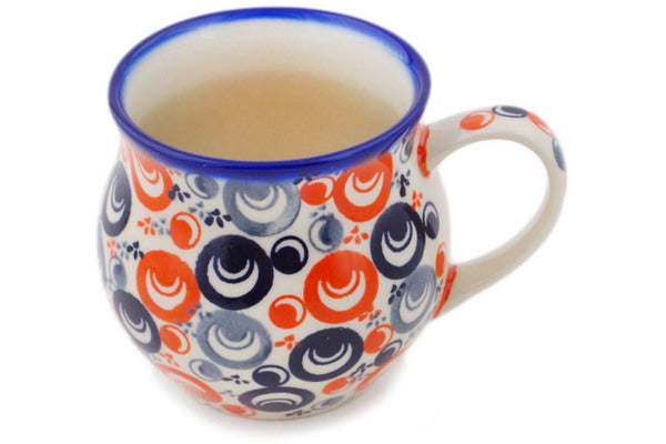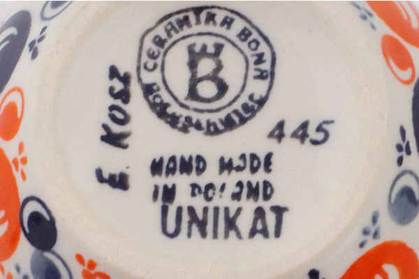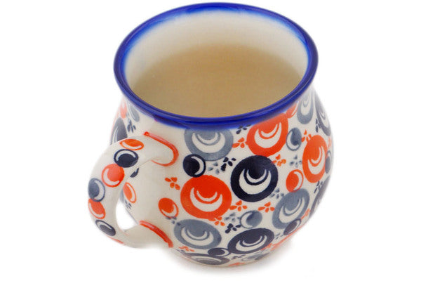 This Polish Pottery Bubble Mug is handmade and handpainted by the Ceramika Bona factory in Boleslawiec, Poland. Manufacturer item number H7151Q. It is 3½" high and measures 4¾" by 3¾". The capacity of this Bubble Mug is 11.77 oz (brimful) and it weighs 0.6 lbs. It is part of the Red Peacock Eye Collection.