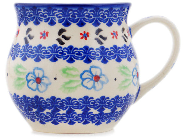 This Polish Pottery Bubble Mug is handmade and handpainted by the Ceramika Bona factory in Boleslawiec, Poland. Manufacturer item number H1953R. It is 3½" high and measures 4¾" by 3¾". The capacity of this Bubble Mug is 11.77 oz (brimful) and it weighs 0.6 lbs. It is part of the Sweet Day Collection.