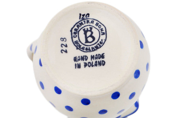 This Polish Pottery Creamer is handmade and handpainted by the Ceramika Bona factory in Boleslawiec, Poland. Manufacturer item number H9762Q. It is 5" high and measures 4¼" by 3½". The capacity of this Creamer is 11.97 oz (brimful) and it weighs 0.8 lbs. It is part of the Blue Polka Dot Collection.