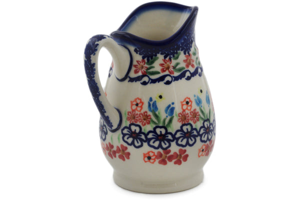 This Polish Pottery Creamer is handmade and handpainted by the Ceramika Bona factory in Boleslawiec, Poland. Manufacturer item number H7380K. It is 5" high and measures 4¼" by 3½". The capacity of this Creamer is 11.97 oz (brimful) and it weighs 0.8 lbs. It is part of the Fanciful Ladybug Collection.