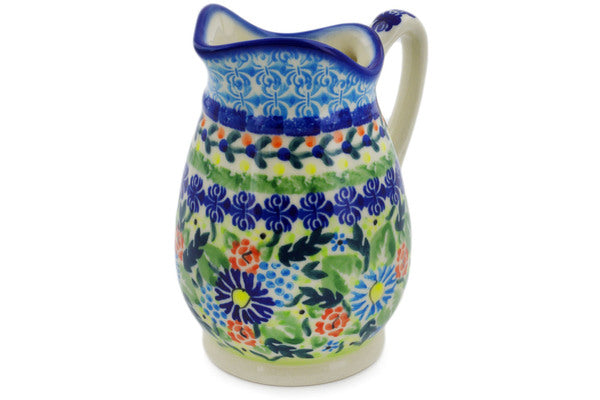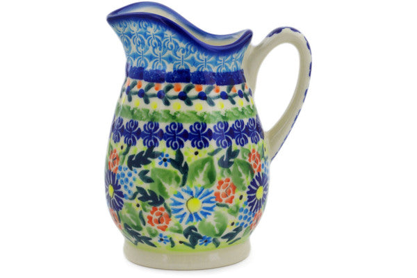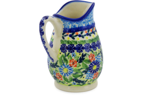 This Polish Pottery Creamer is handmade and handpainted by the Ceramika Bona factory in Boleslawiec, Poland. Manufacturer item number H4494K. It is 5" high and measures 4¼" by 3½". The capacity of this Creamer is 11.97 oz (brimful) and it weighs 0.8 lbs. It is part of the Flor-De-Lis Collection.