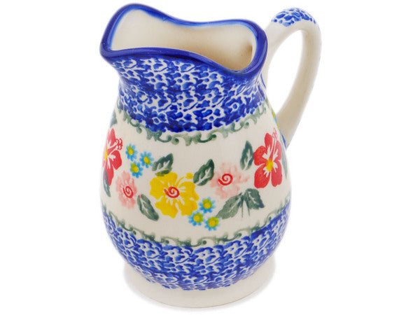 This Polish Pottery Creamer is handmade and handpainted by the Ceramika Bona factory in Boleslawiec, Poland. Manufacturer item number H0254Q. It is 5" high and measures 4¼" by 3½". The capacity of this Creamer is 11.97 oz (brimful) and it weighs 0.8 lbs. It is part of the Hibiscus Haven Collection.