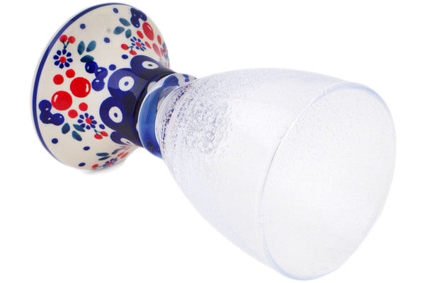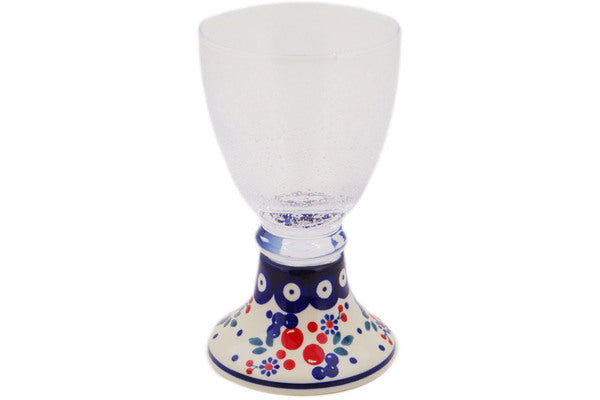 This Polish Pottery Goblet is handmade and handpainted by the Manufaktura factory in Boleslawiec, Poland. Manufacturer item number H4469Q. It is 6½" high and measures 3¾" by 3¾". The capacity of this Goblet is 12.31 oz (brimful) and it weighs 0.9 lbs. It is part of the Burst Of Berries Collection.