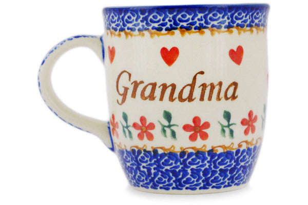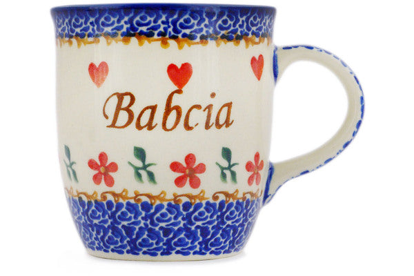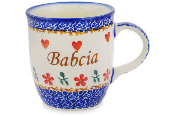This Polish Pottery Mug is handmade and handpainted by the Ceramika Bona factory in Boleslawiec, Poland. Manufacturer item number H5008R. It is 4" high and measures 5" by 3½". The capacity of this Mug is 12.04 oz (brimful) and it weighs 0.8 lbs. It is part of the Babcia Grandma Collection.