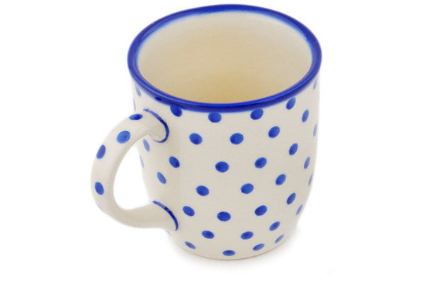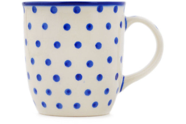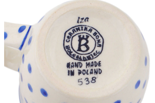 This Polish Pottery Mug is handmade and handpainted by the Ceramika Bona factory in Boleslawiec, Poland. Manufacturer item number H9759Q. It is 4" high and measures 5" by 3½". The capacity of this Mug is 12.04 oz (brimful) and it weighs 0.8 lbs. It is part of the Blue Polka Dot Collection.