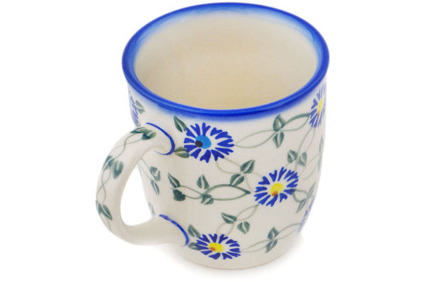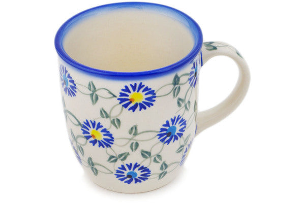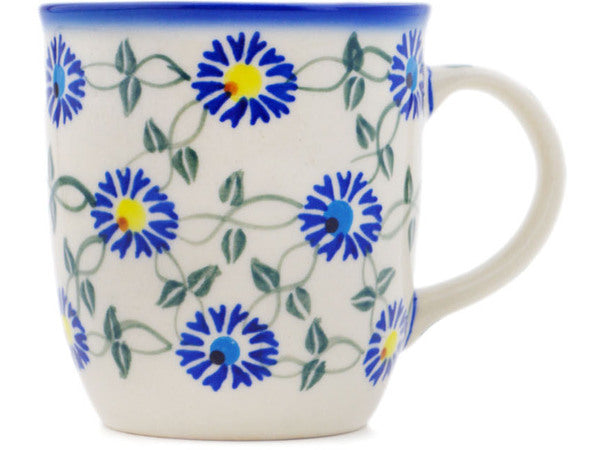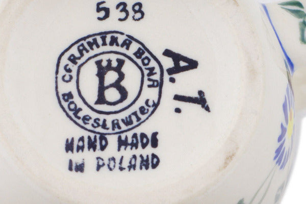 This Polish Pottery Mug is handmade and handpainted by the Ceramika Bona factory in Boleslawiec, Poland. Manufacturer item number H9767Q. It is 4" high and measures 5" by 3½". The capacity of this Mug is 12.04 oz (brimful) and it weighs 0.8 lbs. It is part of the Blue Thistle Beauty Collection.