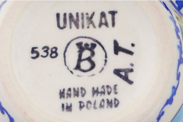 This is a Polish pottery Unikat (Signature) Mug, which means that it has been hand painted with both sponges and brushes and it is signed by the artist who painted it. Unikat pieces are the most intricate works of art. Larger Unikat items take hours of very careful work to finish.
