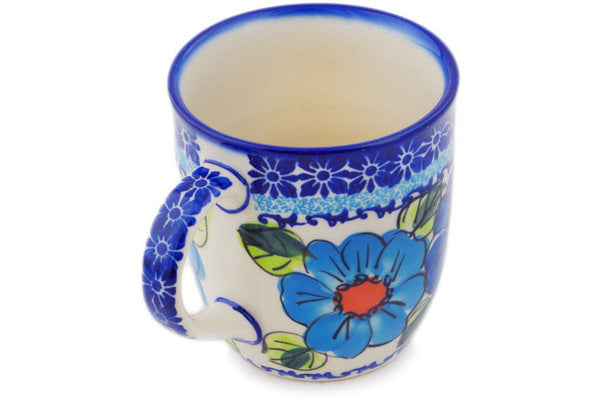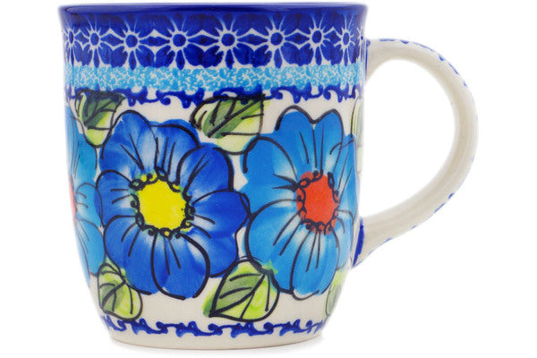 This Polish Pottery Mug is handmade and handpainted by the Ceramika Bona factory in Boleslawiec, Poland. Manufacturer item number H8824Q. It is 4" high and measures 5" by 3½". The capacity of this Mug is 12.04 oz (brimful) and it weighs 0.8 lbs. It is part of the Bold Blue Poppies Collection.
