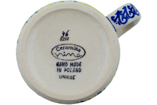 This is a Polish pottery Unikat (Signature) Mug, which means that it has been hand painted with both sponges and brushes and it is signed by the artist who painted it. Unikat pieces are the most intricate works of art. Larger Unikat items take hours of very careful work to finish.