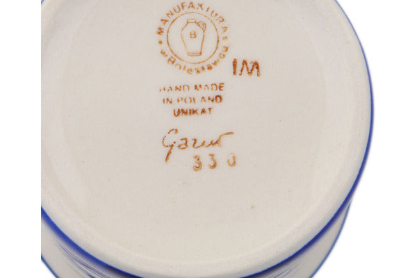 This is a Polish pottery Unikat (Signature) Mug, which means that it has been hand painted with both sponges and brushes and it is signed by the artist who painted it. Unikat pieces are the most intricate works of art. Larger Unikat items take hours of very careful work to finish.