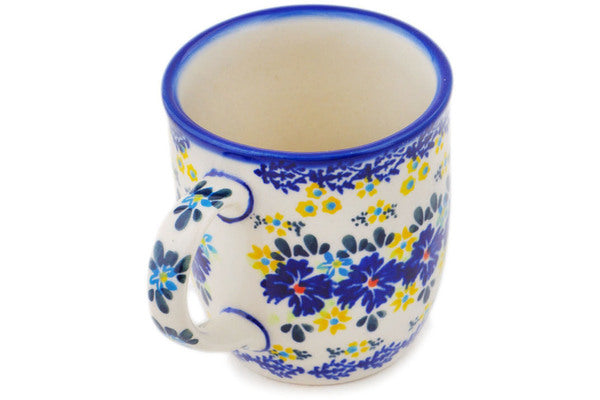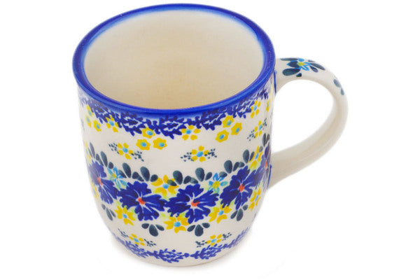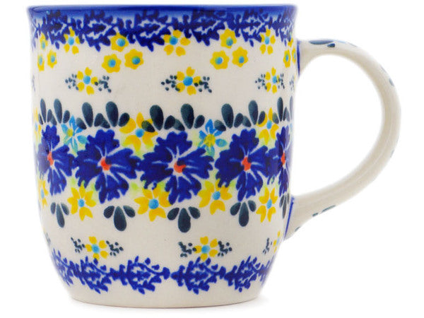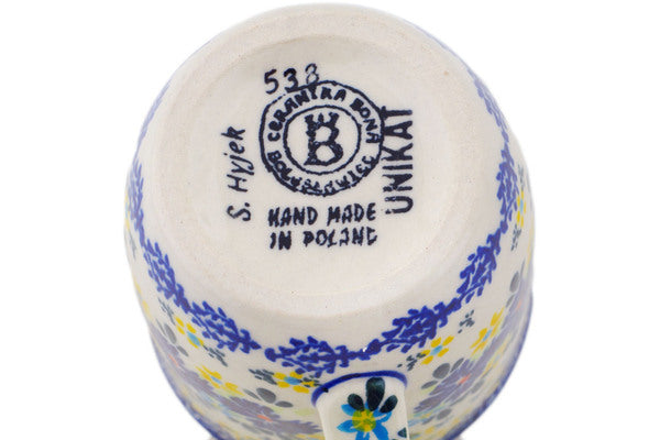 This Polish Pottery Mug is handmade and handpainted by the Ceramika Bona factory in Boleslawiec, Poland. Manufacturer item number H8493Q. It is 4" high and measures 5" by 3½". The capacity of this Mug is 12.04 oz (brimful) and it weighs 0.8 lbs. It is part of the Cornflower Meadow Collection.