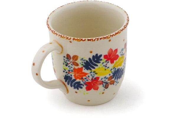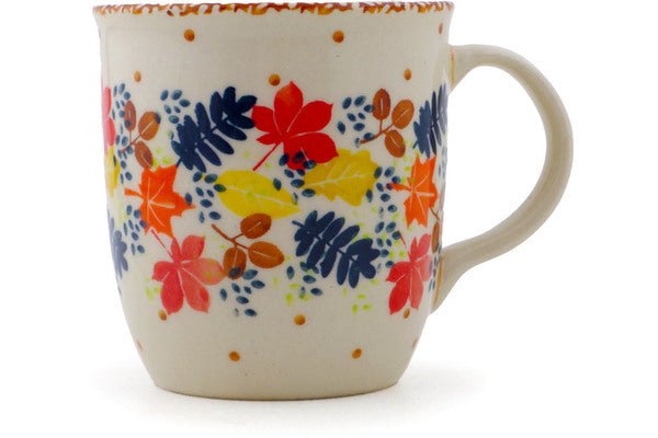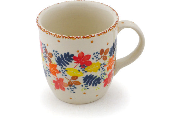 This Polish Pottery Mug is handmade and handpainted by the Ceramika Bona factory in Boleslawiec, Poland. Manufacturer item number H9795Q. It is 4" high and measures 5" by 3½". The capacity of this Mug is 12.04 oz (brimful) and it weighs 0.8 lbs. It is part of the Falling Leaves Collection.