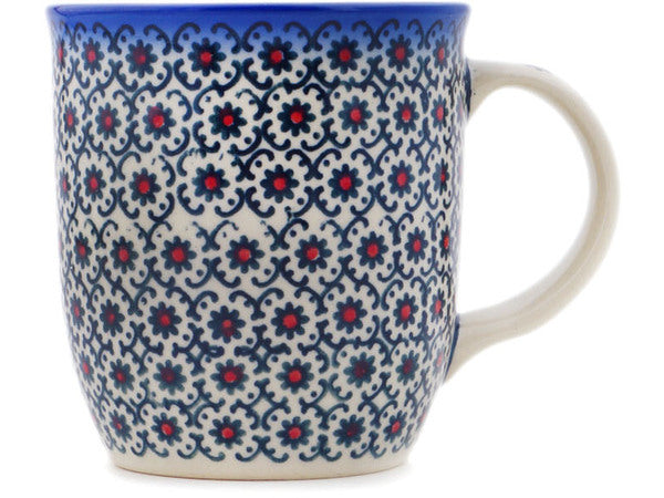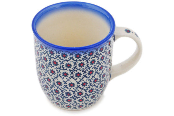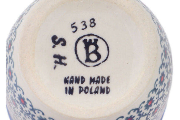 This Polish Pottery Mug is handmade and handpainted by the Ceramika Bona factory in Boleslawiec, Poland. Manufacturer item number H9700Q. It is 4" high and measures 5" by 3½". The capacity of this Mug is 12.04 oz (brimful) and it weighs 0.8 lbs. It is part of the Field Of Black Daisies Collection.