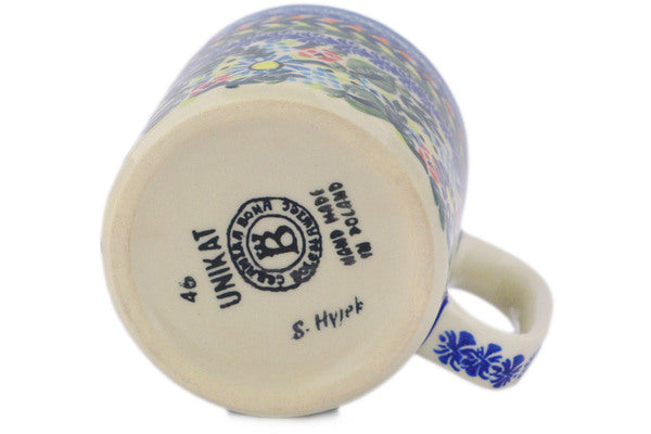 This is a Polish pottery Unikat (Signature) Mug, which means that it has been hand painted with both sponges and brushes and it is signed by the artist who painted it. Unikat pieces are the most intricate works of art. Larger Unikat items take hours of very careful work to finish.