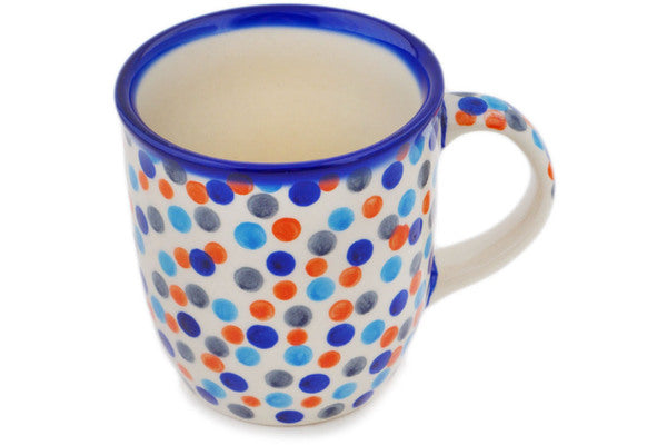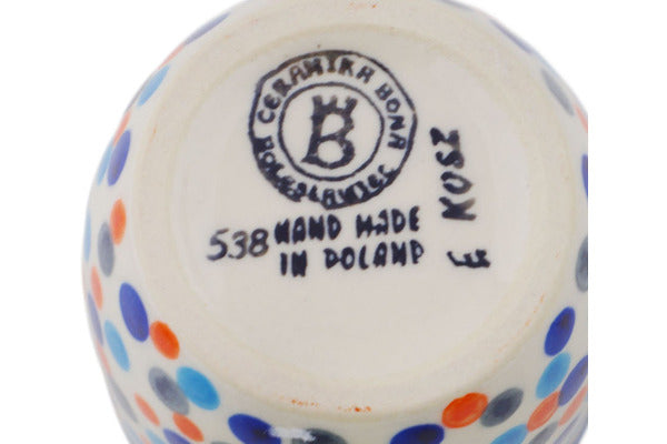 This Polish Pottery Mug is handmade and handpainted by the Ceramika Bona factory in Boleslawiec, Poland. Manufacturer item number H9766Q. It is 4" high and measures 5" by 3½". The capacity of this Mug is 12.04 oz (brimful) and it weighs 0.8 lbs. It is part of the Polka Dot Frenzy Collection.