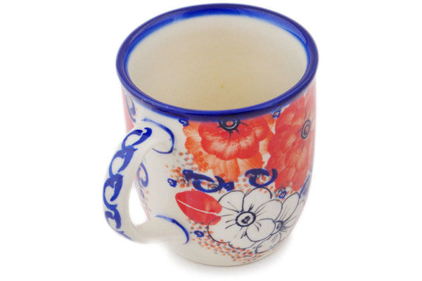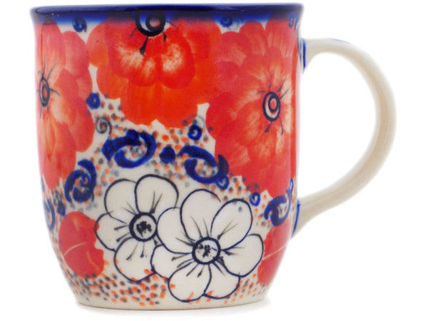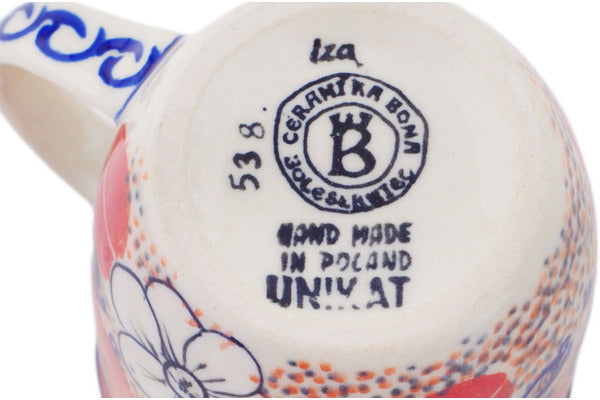 This Polish Pottery Mug is handmade and handpainted by the Ceramika Bona factory in Boleslawiec, Poland. Manufacturer item number H8481Q. It is 4" high and measures 5" by 3½". The capacity of this Mug is 12.04 oz (brimful) and it weighs 0.8 lbs. It is part of the Poppy Passion Collection.
