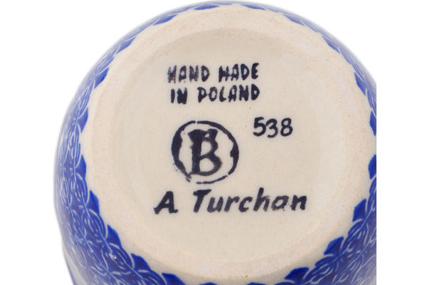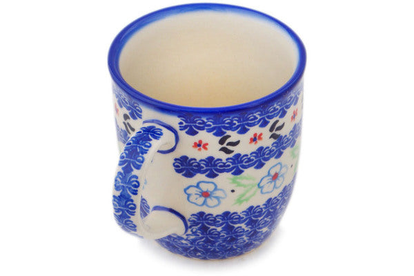 This Polish Pottery Mug is handmade and handpainted by the Ceramika Bona factory in Boleslawiec, Poland. Manufacturer item number H2033R. It is 4" high and measures 5" by 3½". The capacity of this Mug is 12.04 oz (brimful) and it weighs 0.8 lbs. It is part of the Sweet Day Collection.