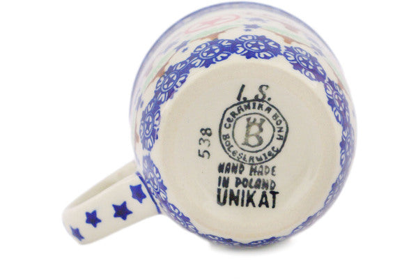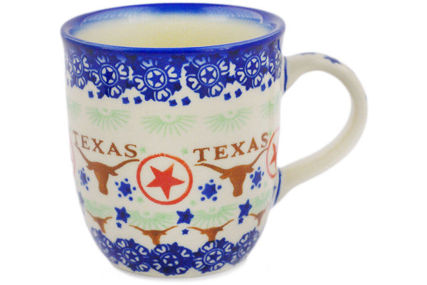 This Polish Pottery Mug is handmade and handpainted by the Ceramika Bona factory in Boleslawiec, Poland. Manufacturer item number H5715R. It is 4" high and measures 5" by 3½". The capacity of this Mug is 12.04 oz (brimful) and it weighs 0.8 lbs. It is part of the Texas State Collection.