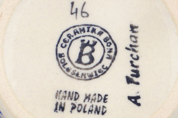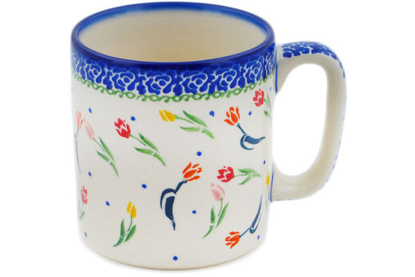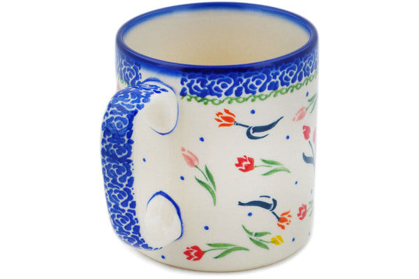 This Polish Pottery Mug is handmade and handpainted by the Ceramika Bona factory in Boleslawiec, Poland. Manufacturer item number H0040R. It is 3¾" high and measures 4¾" by 3½". The capacity of this Mug is 13.12 oz (brimful) and it weighs 0.9 lbs. It is part of the Tulip Meadow Collection.