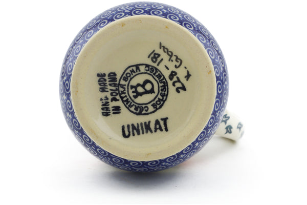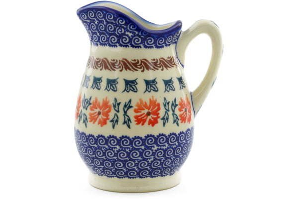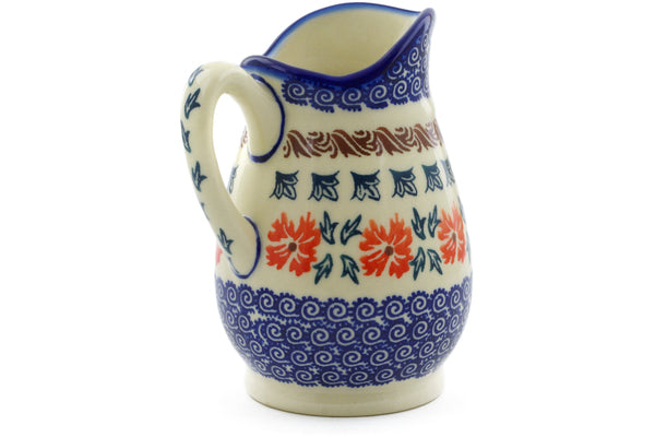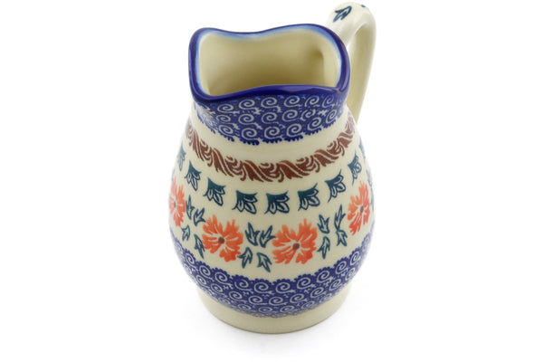 This Polish Pottery Creamer is handmade and handpainted by the Ceramika Bona factory in Boleslawiec, Poland. Manufacturer item number H4262J. It is 5" high and measures 4¼" by 3½". The capacity of this Creamer is 11.97 oz (brimful) and it weighs 0.8 lbs. It is part of the Red Cornflower Collection.