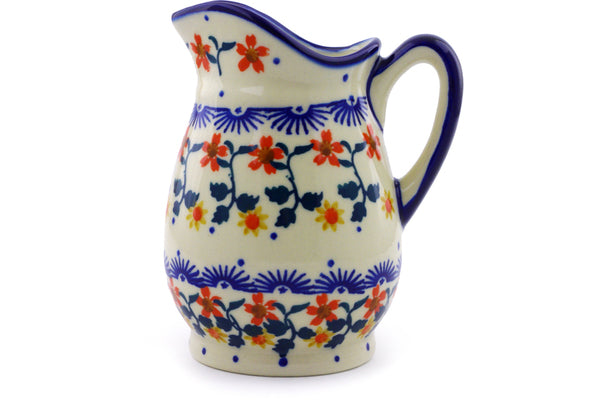 This Polish Pottery Creamer is handmade and handpainted by the Ceramika Bona factory in Boleslawiec, Poland. Manufacturer item number H9114I. It is 5" high and measures 4¼" by 3½". The capacity of this Creamer is 11.97 oz (brimful) and it weighs 0.8 lbs. It is part of the Red Sunflower Collection.