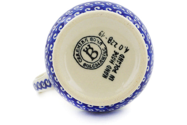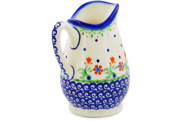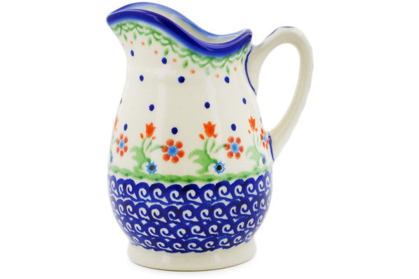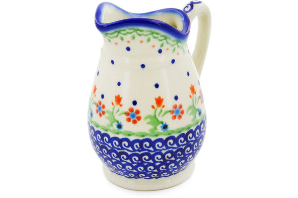 This Polish Pottery Creamer is handmade and handpainted by the Ceramika Bona factory in Boleslawiec, Poland. Manufacturer item number H0081I. It is 5" high and measures 4¼" by 3½". The capacity of this Creamer is 11.97 oz (brimful) and it weighs 0.8 lbs. It is part of the Spring Flowers Collection.