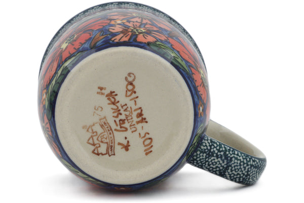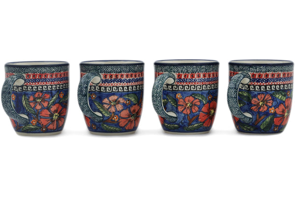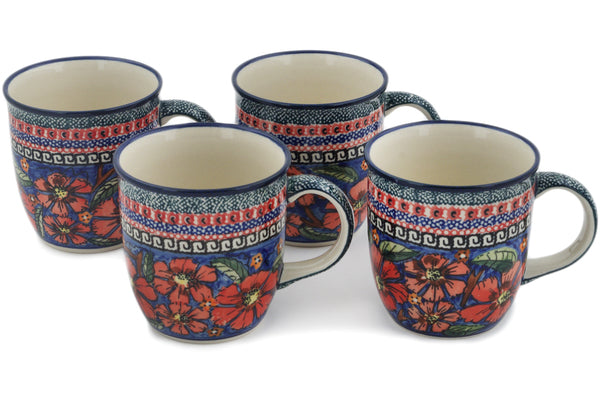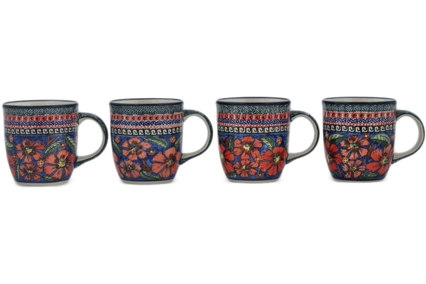 This Polish Pottery Set of 4 Mugs is handmade and handpainted by the Zaklady Ceramiczne factory in Boleslawiec, Poland. Manufacturer item number H0633L. It is 3¾" high and measures 5" by 3½". The capacity of this Set of 4 Mugs is 12.00 oz (brimful) and it weighs 0.8 lbs. It is part of the Poppies Collection.