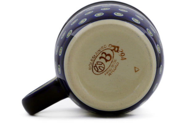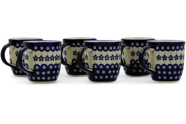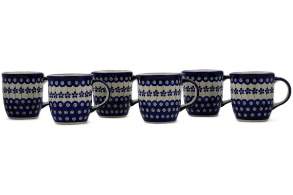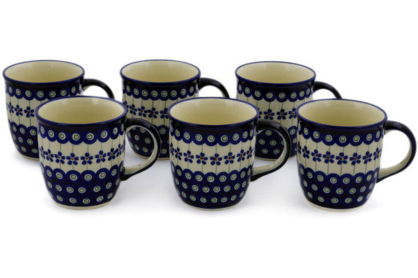 This Polish Pottery Set of 6 Mugs is handmade and handpainted by the Zaklady Ceramiczne factory in Boleslawiec, Poland. Manufacturer item number H0014K. It is 3¾" high and measures 5" by 3½". The capacity of this Set of 6 Mugs is 12.00 oz (brimful) and it weighs 0.8 lbs. It is part of the Flowering Peacock Collection.