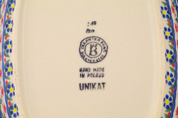 This is a Polish pottery Unikat (Signature) Platter with Handles, which means that it has been hand painted with both sponges and brushes and it is signed by the artist who painted it. Unikat pieces are the most intricate works of art. Larger Unikat items take hours of very careful work to finish.