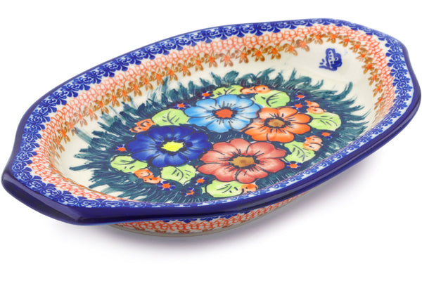 This Polish Pottery Platter with Handles is handmade and handpainted by the Ceramika Bona factory in Boleslawiec, Poland. Manufacturer item number H1394J. It is 1½" high and measures 12½" by 7¾". The capacity of this Platter with Handles is 21.47 oz (brimful) and it weighs 2.4 lbs. It is part of the Butterfly Splendor Collection.
