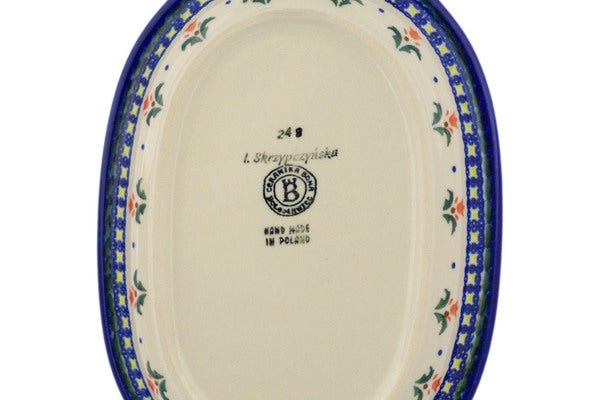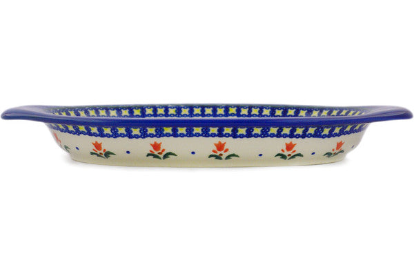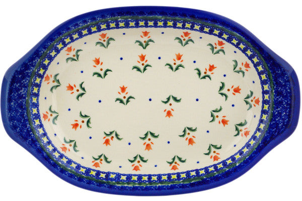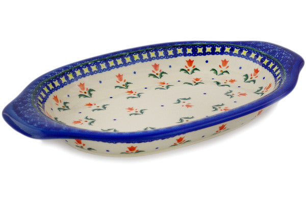 This Polish Pottery Platter with Handles is handmade and handpainted by the Ceramika Bona factory in Boleslawiec, Poland. Manufacturer item number H4245J. It is 1½" high and measures 12½" by 7¾". The capacity of this Platter with Handles is 21.47 oz (brimful) and it weighs 2.4 lbs. It is part of the Cocentric Tulips Collection.