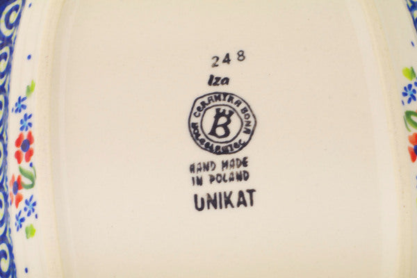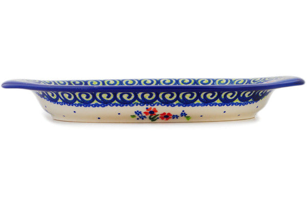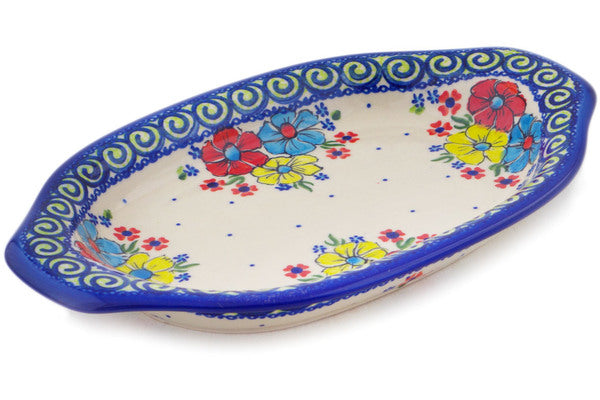 This Polish Pottery Platter with Handles is handmade and handpainted by the Ceramika Bona factory in Boleslawiec, Poland. Manufacturer item number H2126R. It is 1½" high and measures 12½" by 7¾". The capacity of this Platter with Handles is 21.47 oz (brimful) and it weighs 2.4 lbs. It is part of the Country Three Collection.