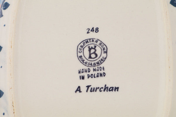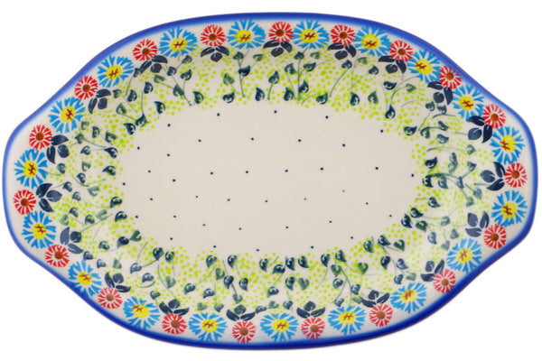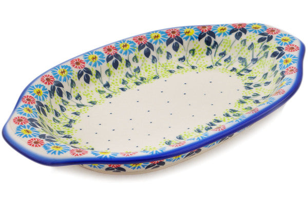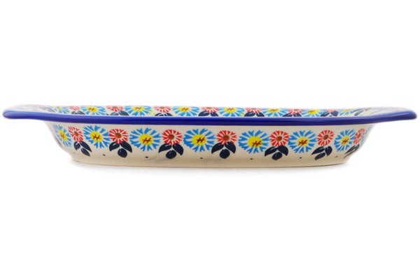 This Polish Pottery Platter with Handles is handmade and handpainted by the Ceramika Bona factory in Boleslawiec, Poland. Manufacturer item number H2042R. It is 1½" high and measures 12½" by 7¾". The capacity of this Platter with Handles is 21.47 oz (brimful) and it weighs 2.4 lbs. It is part of the Long-stemmed Beauties Collection.