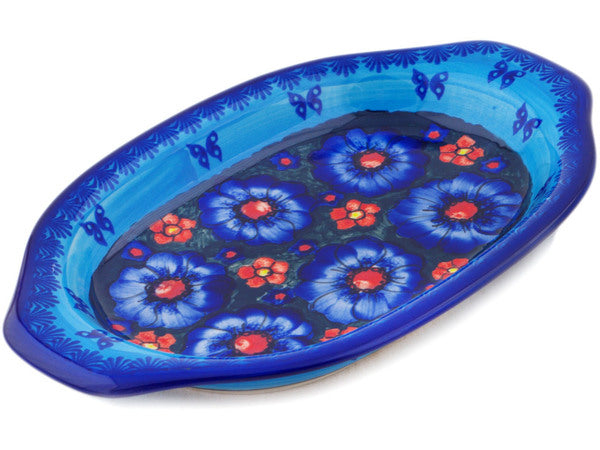 This Polish Pottery Platter with Handles is handmade and handpainted by the Ceramika Bona factory in Boleslawiec, Poland. Manufacturer item number H9346P. It is 1½" high and measures 12½" by 7¾". The capacity of this Platter with Handles is 21.47 oz (brimful) and it weighs 2.4 lbs. It is part of the Midnight Garden Collection.