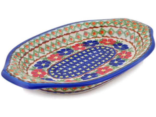This Polish Pottery Platter with Handles is handmade and handpainted by the Ceramika Bona factory in Boleslawiec, Poland. Manufacturer item number H1794Q. It is 1½" high and measures 12½" by 7¾". The capacity of this Platter with Handles is 21.47 oz (brimful) and it weighs 2.4 lbs. It is part of the Paradise Poppy Collection.