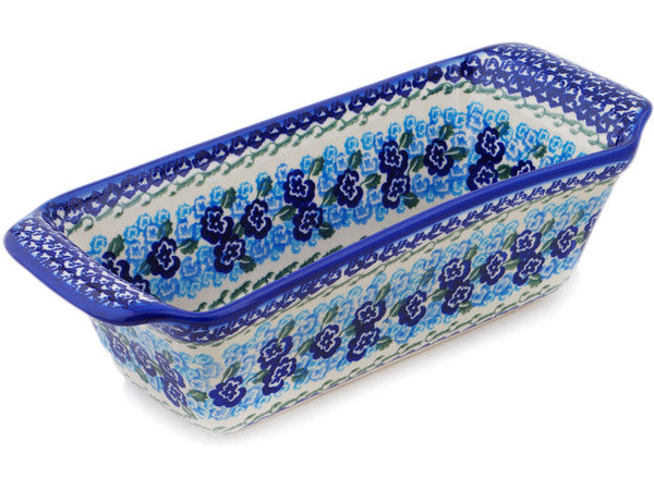 This Polish Pottery Rectangular Baker is handmade and handpainted by the Ceramika Bona factory in Boleslawiec, Poland. Manufacturer item number H0149P. It is 3½" high and measures 12¼" by 5". The capacity of this Rectangular Baker is 50.72 oz (brimful) and it weighs 2.6 lbs. It is part of the Blue Kiss Blooms Collection.