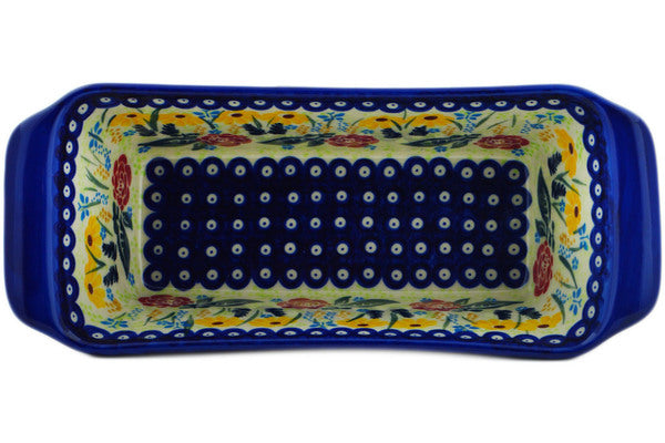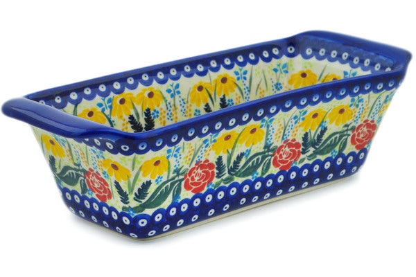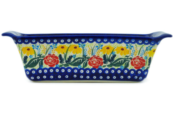 This Polish Pottery Rectangular Baker is handmade and handpainted by the Ceramika Bona factory in Boleslawiec, Poland. Manufacturer item number H0297P. It is 3½" high and measures 12¼" by 5". The capacity of this Rectangular Baker is 50.72 oz (brimful) and it weighs 2.6 lbs. It is part of the Summer's Garden Collection.